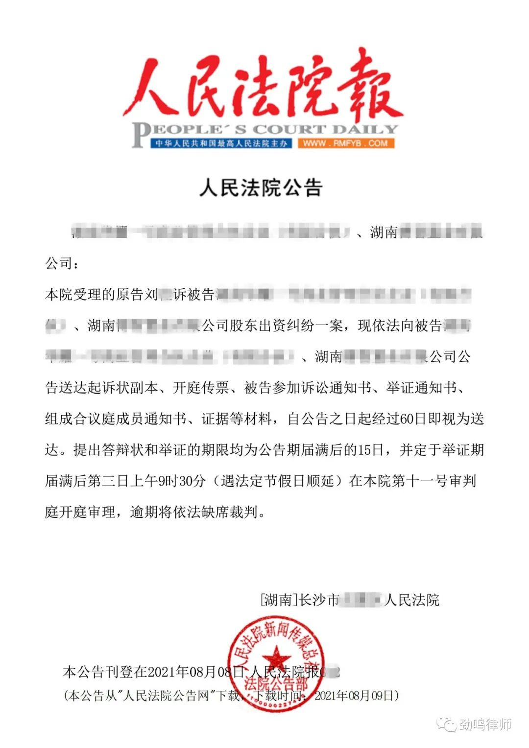8月9日8时55分,我所戴成龙律师收到第三方企业征信机构的监控预警信息推送。信息显示某常年法律顾问公司客户发生一条风险动态,新增一涉及该公司的法院公告。收到信息后,戴成龙律师立即向客户询问有关情况,但客户未收到与该案有关的任何材料。随即,我所律师通过人民法院公告网、人民法院报网站核实到,该公司因涉及一起股东出资纠纷案,被原告刘某起诉至长沙市某法院,8月8日,长沙市某法院在《人民法院报》刊登公告,送达该案起诉状副本、开庭传票等文书。